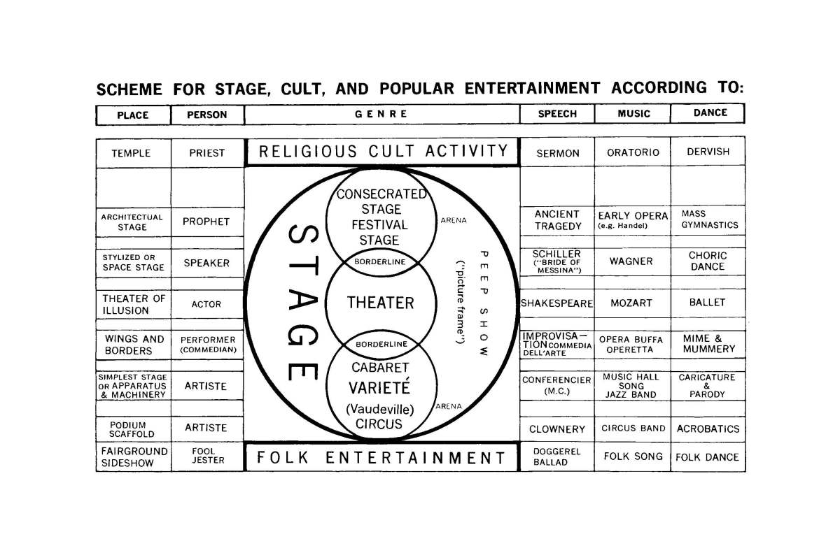 Today is the birthday of Oskar Schlemmer (1888–1943), one of the doyens of the Bauhaus and perhaps its most seminal theatrical exponent. Merging the threads of pantomimic, heightened expression and mechanized movement and rhythm, Schlemmer’s designs and productions provided one of the many modernist answers to the (in)famous concept of the Gesamtkunstwerk, the “unified” work of art, as (in)famously espoused in Wagnerian aesthetics. In keeping with this schematized approach to theatre, Schlemmer provided the above diagram of “entertainments” in the seminal 1925 anthology Die Bühne im Bauhaus, translated in English in 1961 by Arthur S. Wensinger as The Theater of the Bauhaus. I always find it fascinating. Where does your “theatre” fit in?