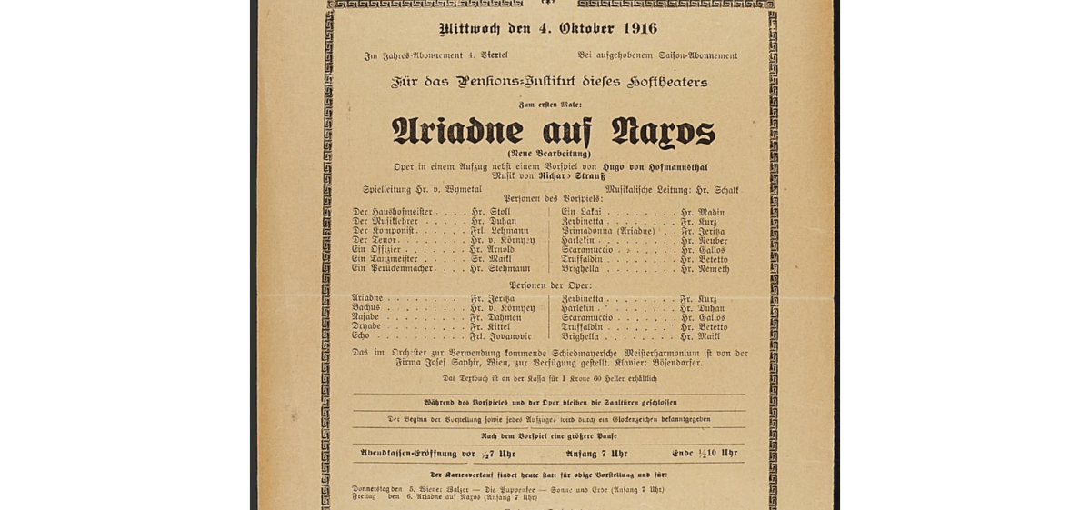 Already within months of the premiere of the original version on October 25, 1912 (Ariadne I, for lack of a better shorthand), the creators repeatedly discussed how to salvage their fetching Zwitter, as Strauss deemed it in his memoirs. (Generally translated as “hermaphrodite,” the term “androgyne” is a more suitable and subtle rendering reflecting the hybrid nature of Ariadne I as a combination of an original opera/commedia dell’arte divertissement with a fresh adaptation/translation of Molière’s Le Bourgeois gentilhomme.) These exchanges carried on while they each crisscrossed Europe to supervise local premieres while completing their nascent ballet Josephs Legende (1914). What was intended as a stopgap before Die Frau ohne Schatten was taking on a new life of its own.